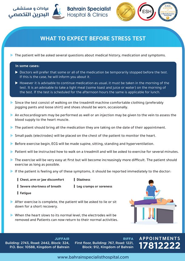 - قبل بدء التمرين سيتم إجراء تخطيط كهربية القلب على وضعية الاستلقاء والجلوس والوقوف و فرط التنفس