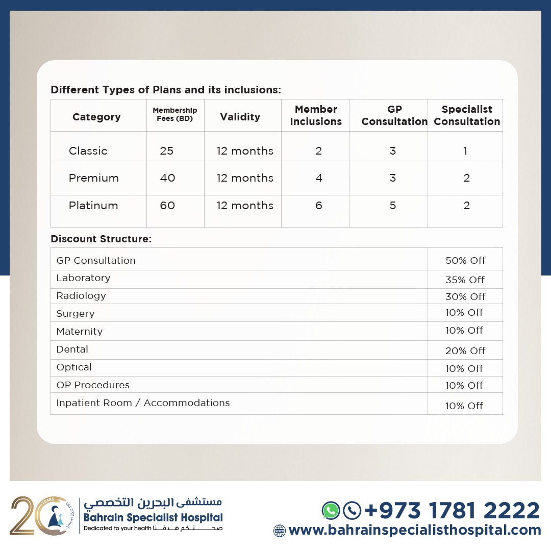 1. Classic: Price 25 BD - 4 free consultations valid for 12 months, provision to add 2 beneficiaries
