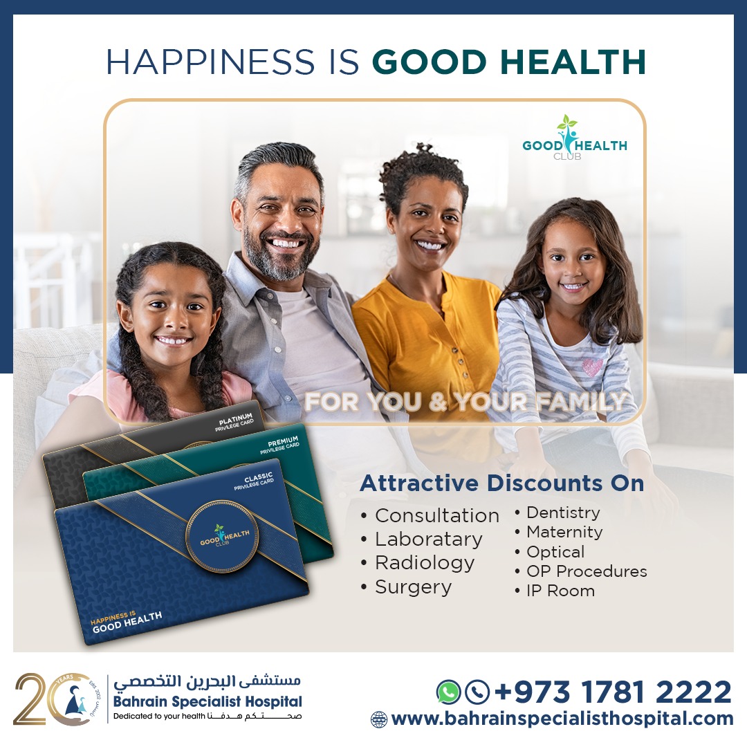 Are your medical bills getting too heavy? You can now get affordable healthcare in Bahrain with the help of Good Health Privilege Cards* from Bahrain Specialist Hospital. Get you and your loved ones all essential check-ups and treatments at affordable rates by experts at Bahrain Specialist Hospital. The privilege card can be used by people on a visiting visa too! We offer three packages you can choose from:
