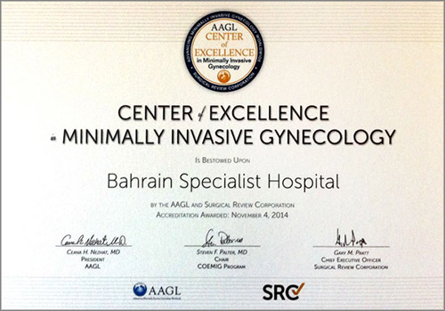 حصل مستشفى البحرين التخصصي على تقدير دولي نادر لكونه مركزًا متميزًا لأمراض النساء بأقل تدخل جراحي من قبل مؤسسة المراجعة الجراحية والجمعية الأمريكية لتنظير البطن (AAGL).