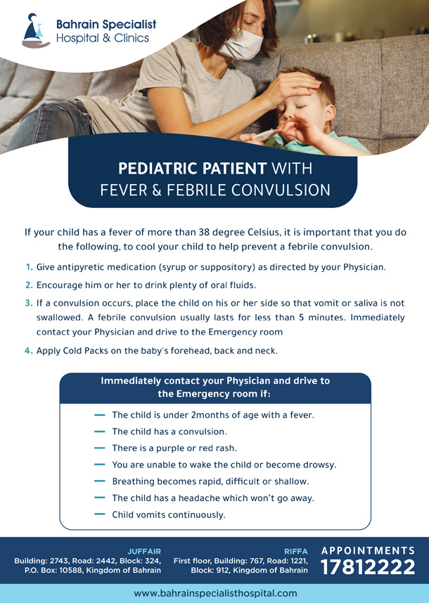 - في حالة حدوث تشنج ضع الطفل على جنبه حتى لا يبتلع القيء أو اللعاب عادة ما يستمر التشنج الحموي لمدة تقل عن 5 دقائق، اتصل على الفور بطبيبك وتوجه إلى غرفة الطوارئ.