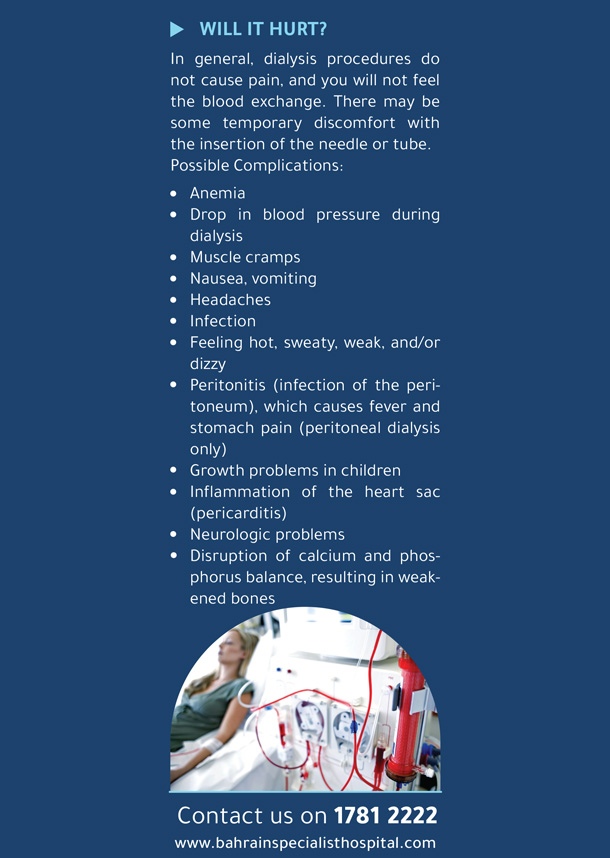 ويستمرون في غسيل الكلى لبقية حياتهم (أو حتى إجراء عملية زرع كلية) وهذا ما يسمى مرض الكلى في نهاية المرحلة (الداء الكلوي بمراحله الأخيرة) قد يحدث الداء الكلوي بمراحله الأخيرة بسبب مجموعة متنوعة من الحالات التي يمكن أن تضعف وظائف الكلى بما في ذلك مرض السكري وسرطان الكلى وتعاطي المخدرات وارتفاع ضغط الدم أو مشاكل الكلى الأخرى وغسيل الكلى ليس علاجًا للداء الكلوي بمراحله الأخيرة ولكنه يساعدك على الشعور بالتحسن والعيش لفترة أطول.