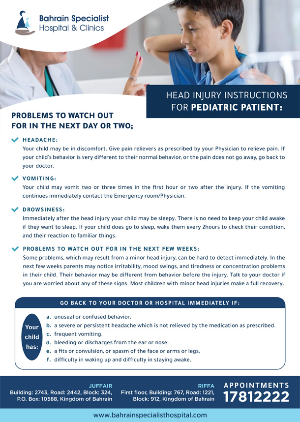 مباشرة بعد إصابة الرأس قد يشعر طفلك بالنعاس، ليست هناك حاجة لإبقاء طفلك مستيقظًا إذا أراد النوم وإذا ذهب طفلك إلى النوم قم بإيقاظه كل ساعتين للتحقق من حالته وانتبه لرد فعلهم على الأشياء المألوفة.