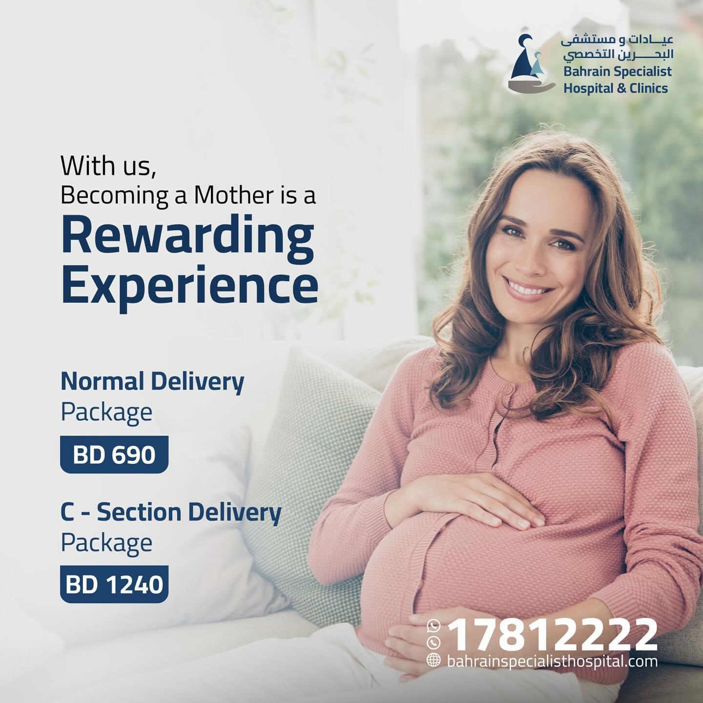 - الولادة الطبيعية: باقتنا بسعر 690 دينار بحريني تشمل رعاية شاملة وتجربة ولادة طبيعية مريحة وآمنة.